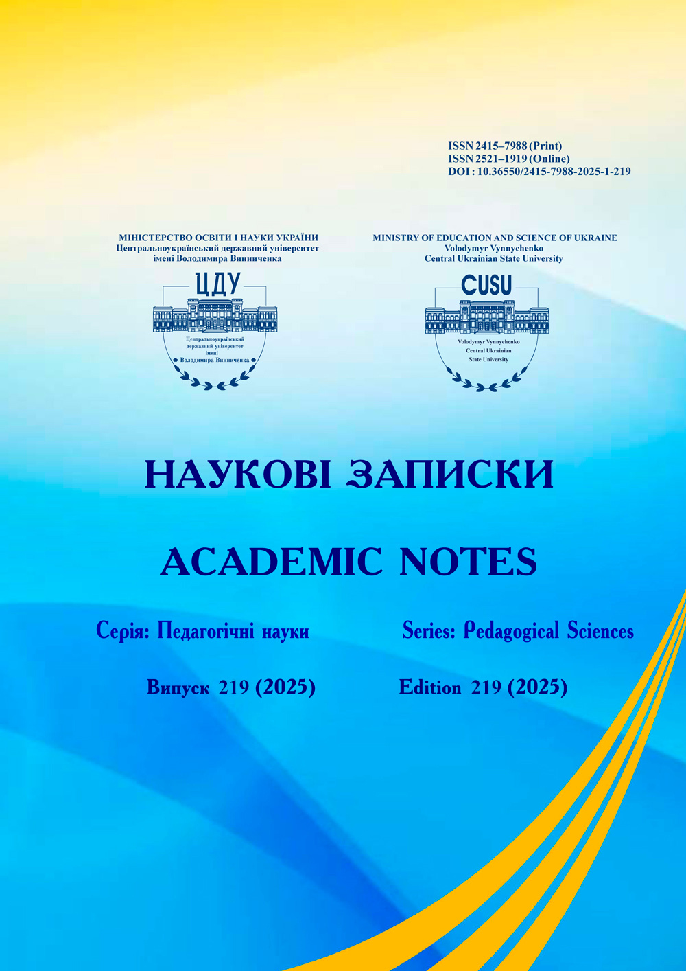 № 219 (2025)«Наукові записки. Серія: Педагогічні науки» включено до Переліку наукових фахових видань України категорії «Б» (галузь знань: Освіта/Педагогіка), згідно з Наказом Міністерства освіти і науки України № 886 від 02.07.2020.