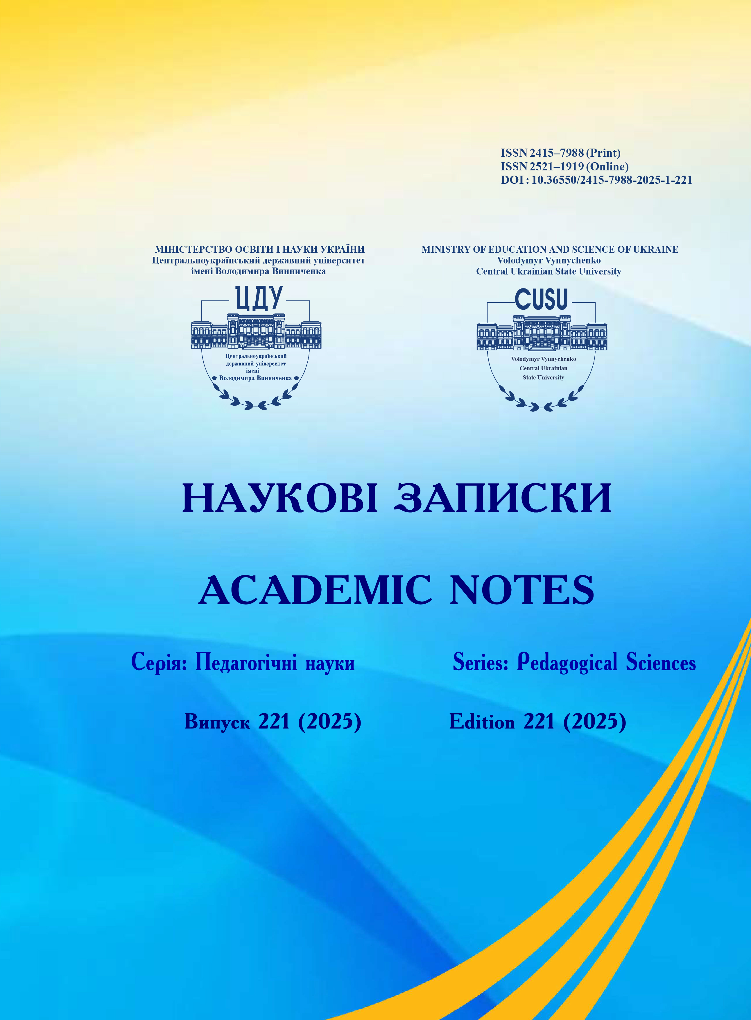 № 221 (2025)«Наукові записки. Серія: Педагогічні науки» включено до Переліку наукових фахових видань України категорії «Б» (галузь знань: Освіта/Педагогіка), згідно з Наказом Міністерства освіти і науки України № 886 від 02.07.2020.